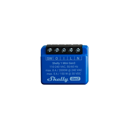 Shelly 1 Mini Gen3 è un interruttore smart ultra compatto con contatti puliti, che consente il controllo remoto di dispositivi elettrici tramite smartphone, tablet, PC o sistemi di automazione domestica.