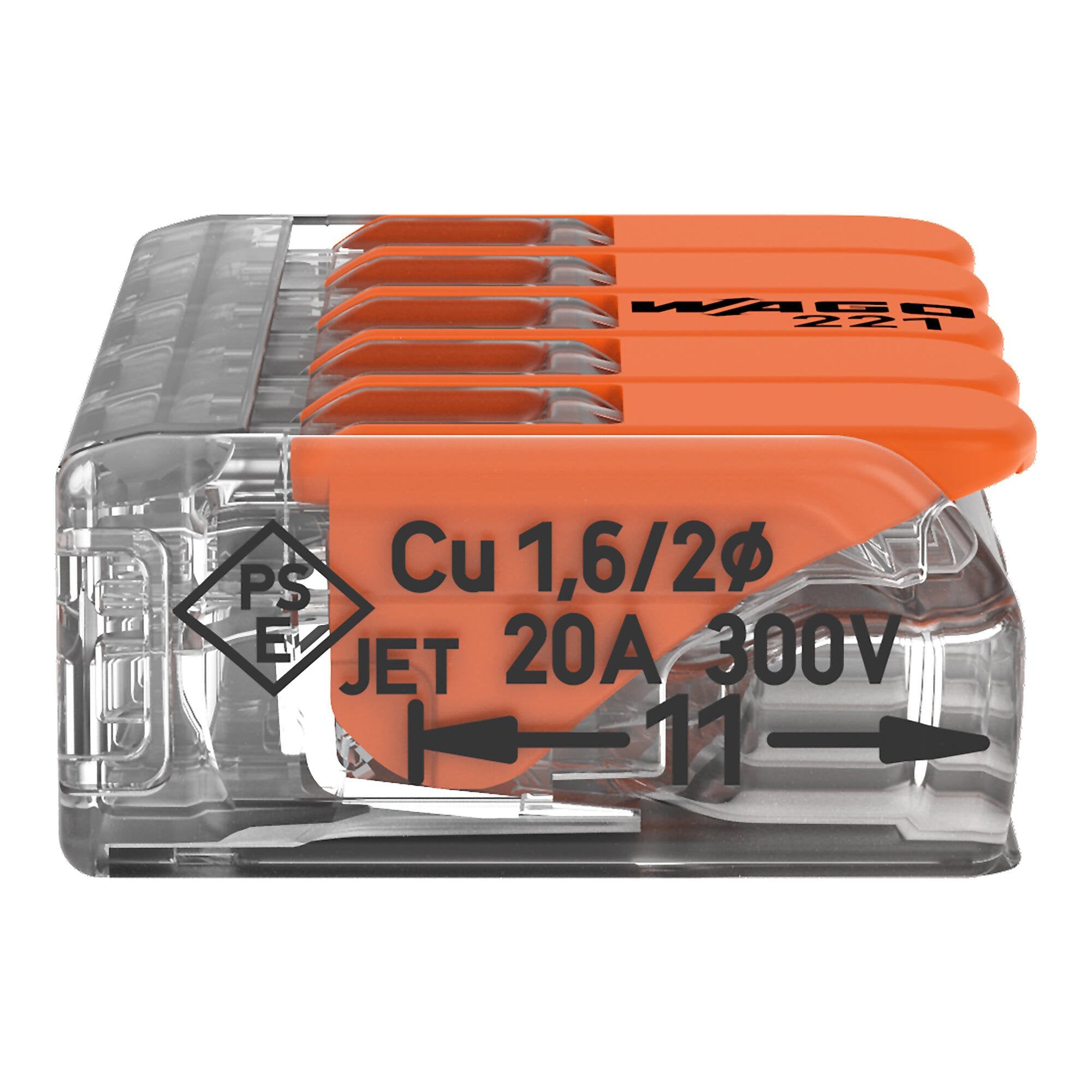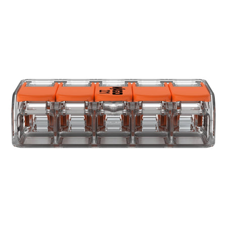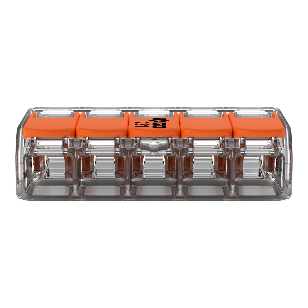 Progettato per unire fino a cinque conduttori contemporaneamente nello stesso punto di contatto, questo morsetto universale a leva risolve in modo elegante e sicuro il problema dell'affollamento nelle scatole di derivazione.